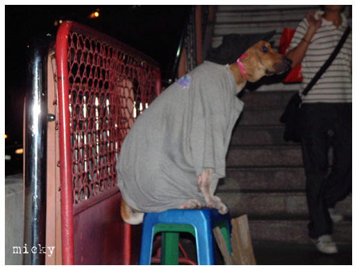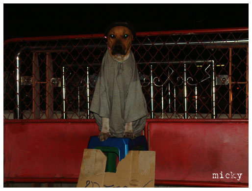 ขอเงินซื้ออาหารให้ผม(หมา+เจ้าของ) ด้วย...ผม(หมา+เจ้าของ)หิว แผนการตลาดสุดยอดของขอทานยุคนี้ที่อดให้ไม่ได้....หลายคนคงเคยเห็นเจ้าตัวนี้บ้างแล้ว ตรงทางลงสะพานลอยรถไฟฟ้าฝั่งโรงพยาบาลราชวิถี ที่นั่งอย่างอดทน จนคนผ่านไปผ่านมาหยุดดู และให้เงินด้วยความน่ารักของมันอีกครั้งที่เจอ มันกำลังเมื่อยเลยลงมายืดเส้นยืดสาย โดยเจ้าของ(ขอทาน)ของมันมาช่วยนวดด้วย แล้วพามันไปนั่งอย่างเดิม อืม.......... เจ้าตูบนี่ก็ให้ความร่วมมือย่างดีเชียว... เห็มมาก็หลายตัว ที่ร่วมทำการตลาดชั้นเยี่ยมกับขอทาน(คน) จนออกทีวีมาแล้ว ... แต่เจ้าตัวนี้ซิ...เห็นมันแล้วแล้วก็อดยิ้มไม่ได้จริงกับความน่ารัก และสีหน้าของมัน บวกกับความอดทนของมัน...ขนาดเจอแสง Flash ของเจ้า FujiFinePix 6900 มันยังทำเฉยไม่หวั่นไหวอีก....เลยให้ค่าจ้างนายแบบเจ้าตูบไป 10 บาท....(แต่พอมองลงไปในกระป๋องแล้วก็ต้องตกใจ เหรียญเงินเพียบ น่าจะเกิน300 แน่ ๆ เหรียญ 10 ทั้งนั้น....ต้องชมเจ้าของหมา(ขอทาน)จริงๆ ฝึกเจ้าตูบได้ขนาดนี้....กว่าจะถ่ายได้เหนื่อยมาก เจ้า 6900 มันกลัวความมืด.. เลยต้องให้แฟนเอามือถือไปไว้ใกล้ แล้วค่อยโฟกัส เลยได้ภาพมาอย่างที่เห็นทีม Fuji อิอิอิ เอาบ้างซิ ตั้งทีมซะเลย